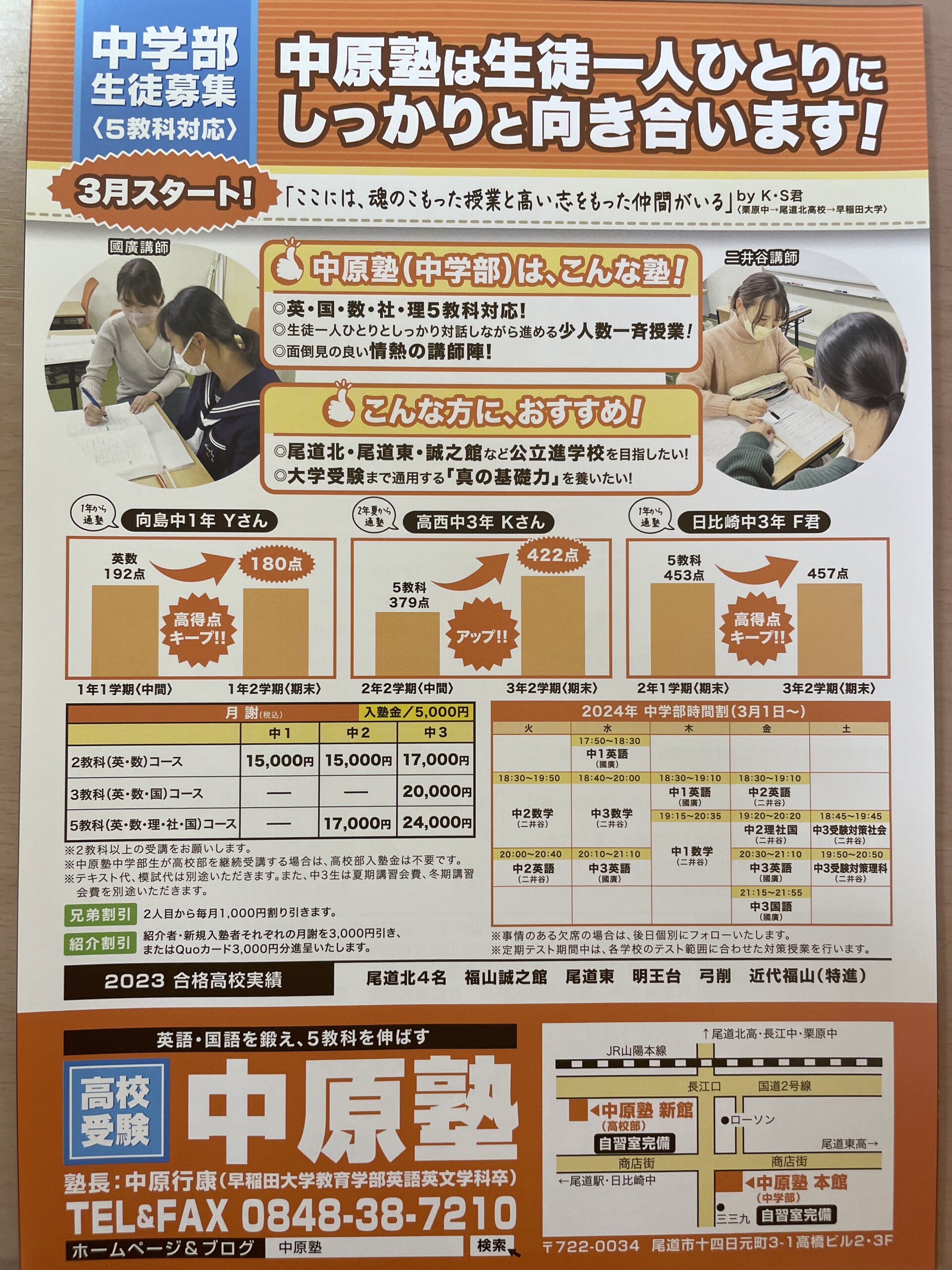 受講科目は、チラシの受講例以外でも自由に組み合わせることができます。例えば、中3・2教科(英・国)、中3・4教科(英・国・理・社)なども可能です。